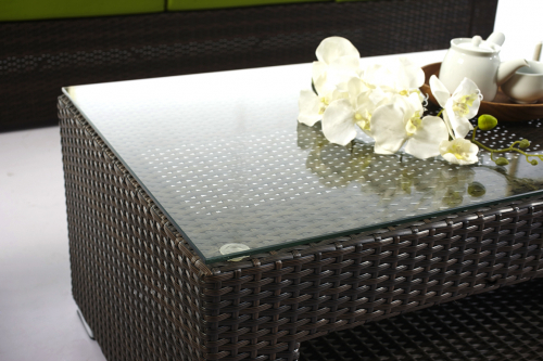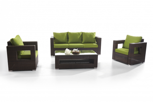 Столик комплектуется стеклянной столешницей. Диван и кресла подушками.