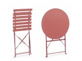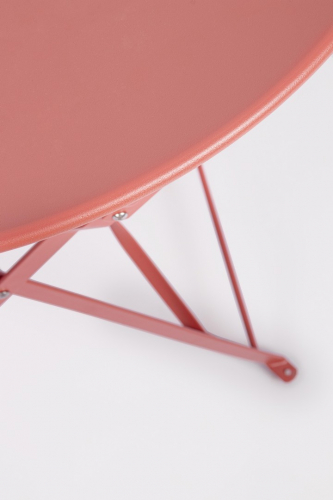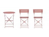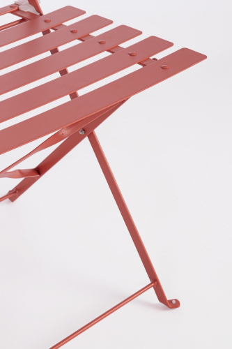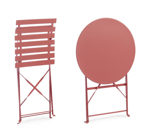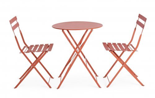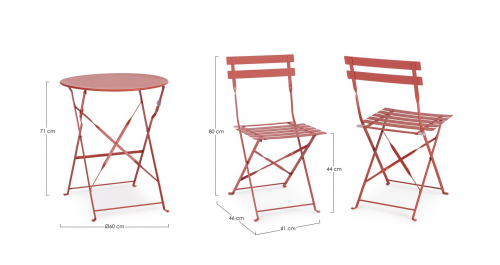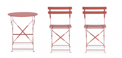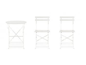Набор состоит из стола и двух стульев. Мебель полностью сделана из стали порошковым покрытием (полиэстер) для наружного использования (e-coating) с матовой отделкой.