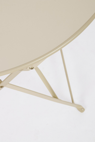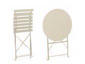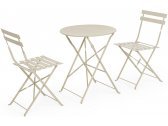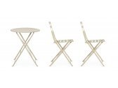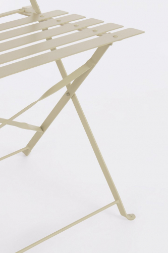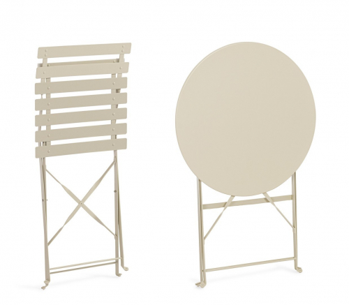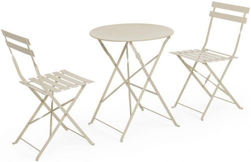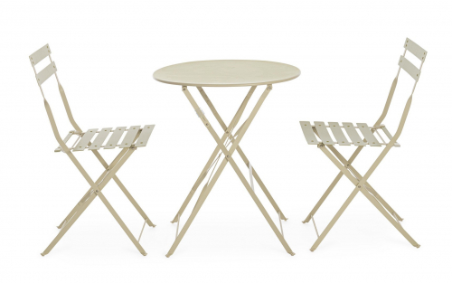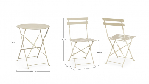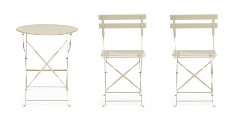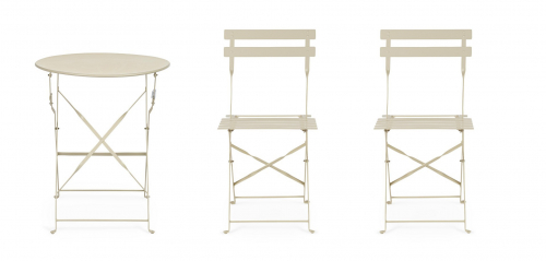 Набор состоит из стола и двух стульев. Мебель полностью сделана из стали порошковым покрытием (полиэстер) для наружного использования (e-coating) с матовой отделкой.
