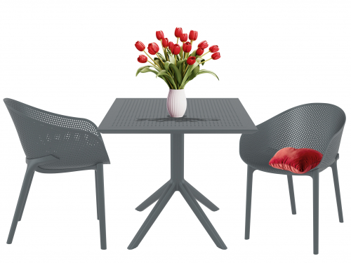 Комплект Sky состоит из квадратного стола и двух кресел. Квадратный пластиковый стол Sky со столешницей из погодостойкого пластика и каркасом из металла. Легкое, как сам воздух, но при этом прочное кресло Sky изготавливается из полипропилена, упрочненного стекловолокном, полученным с использованием новейшего поколения технологий формования пластмасс под давлением.