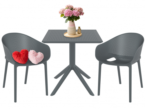 Комплект Sky 70 Pro состоит из квадратного стола и двух кресел. Квадратный пластиковый стол Sky со столешницей из погодостойкого пластика и каркасом из металла. Легкое, как сам воздух, но при этом прочное кресло Sky Pro изготавливается из полипропилена, упрочненного стекловолокном, полученным с использованием новейшего поколения технологий формования пластмасс под давлением.