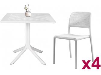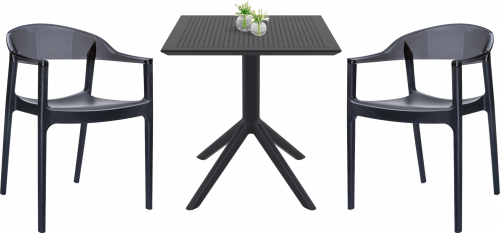 Комплект Sky Carmen состоит из квадратного стола и двух кресел. Квадратный пластиковый стол Sky со столешницей из погодостойкого пластика и каркасом из металла. Пластиковое кресло Carmen изготовлено по новейшей технологии формования пластмасс под давлением. Сиденье выполнено из полипропилена, усиленного стекловолокном, а спинка - из прозрачного поликарбоната Makrolon® - чрезвычайно прочного, легкого материала со стеклянной прозрачностью и устойчивостью к ударам даже при низких температурах.