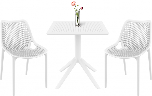 Комплект Sky Air состоит из квадратного стола и двух стульев. Квадратный пластиковый стол Sky со столешницей из погодостойкого пластика и каркасом из металла. Стул Air с перфорированными сиденьем изготавливается из полипропилена, упрочненного стекловолокном, полученным с использованием новейшего поколения технологий формования пластмасс под давлением.