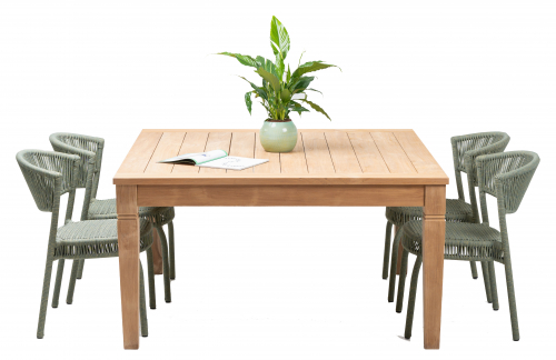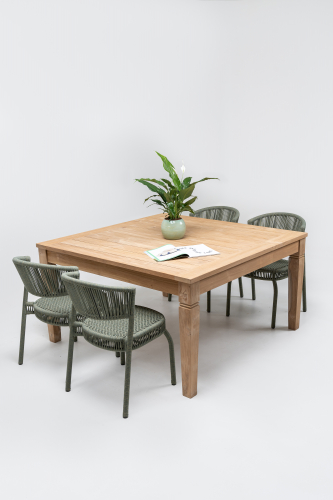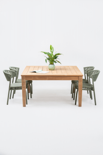 Комплект обеденной мебели состоит из очень функционального и уникального стола Java из настоящего массива тика с полностью натуральной матовой отделкой и неизменным классическим вкусом, а также плетеных стульев Bonnie, которые привлекают внимание своим интересным плетением из роупа и современным дизайном. Вместе эти предметы мебели создают очень красивый набор для использования на улице. Он отлично подойдет для летних площадок кафе, террас ресторанов, открытых пространств отелей или частных загородных домов для обустройства задних двориков.