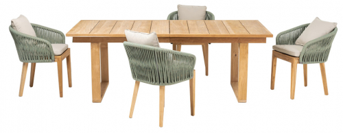 Комплект обеденной мебели Dakota, состоящий из раздвижного стола и плетеных кресел станет отличным вариантом для обустройства различных обеденных зон на открытом воздухе в кафе, ресторанах, отелях или в частных загородных домах на задних двориках. Функциональной особенностью комплекта является возможность изменять длину стола от 2100 до 2700 мм. Он обладает высоким качеством материалов изготовления, мастерством исполнения и строгими линиями. Стол дополняют плетеные обеденные кресла, которые изготавливаются из прочной тиковой структуры, алюминия и ручного плетения высочайшего качества. Такие особенности делают набор очень ярким и придают ему гостеприимный и домашний характер.