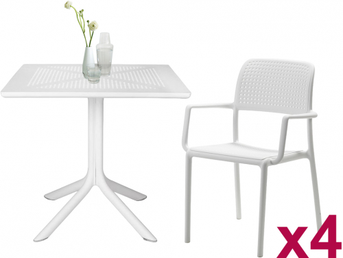 Комплект пластиковой мебели Clip 80 Bora состоит из четырех кресел Bora и стола Clip 80 и украсит любую открытую площадку: балкон загородного дома, террасу кафе или ресторана, лаунж зону бассейна. Материалы не подвержены воздействию УФ-излучения, благодаря этому стол и кресла долго сохраняют свой первоначальный вид и не выцветают на солнце.