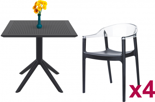 Комплект Sky Carmen состоит из квадратного стола и четырех кресел. Квадратный пластиковый стол Sky со столешницей из погодостойкого пластика и каркасом из металла. Пластиковое кресло Carmen изготовлено по новейшей технологии формования пластмасс под давлением. Сиденье выполнено из полипропилена, усиленного стекловолокном, а спинка - из прозрачного поликарбоната Makrolon® - чрезвычайно прочного, легкого материала со стеклянной прозрачностью и устойчивостью к ударам даже при низких температурах.