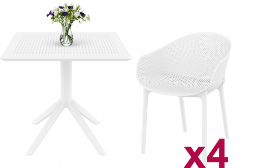Комплект Sky состоит из квадратного стола и четырех кресел. Квадратный пластиковый стол Sky со столешницей из погодостойкого пластика и каркасом из металла. Легкое, как сам воздух, но при этом прочное кресло Sky изготавливается из полипропилена, упрочненного стекловолокном, полученным с использованием новейшего поколения технологий формования пластмасс под давлением.