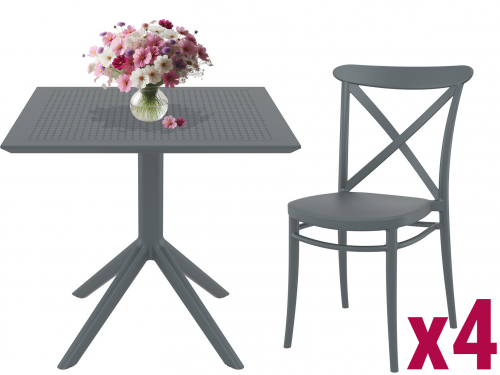 Комплект Sky Cross состоит из квадратного стола и четырех стульев. Квадратный пластиковый стол Sky со столешницей из погодостойкого пластика и каркасом из металла. Стул Cross изготавливается из полипропилена, упрочненного стекловолокном, полученным с использованием новейшего поколения технологий формования пластмасс под давлением.