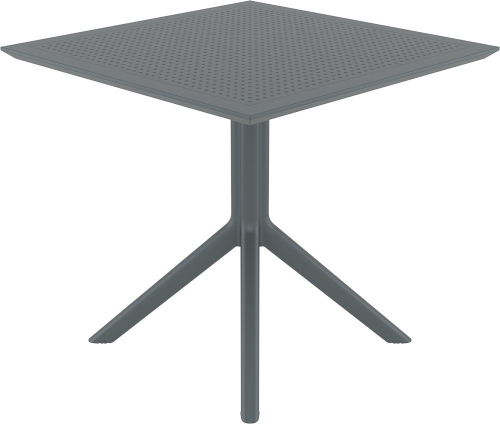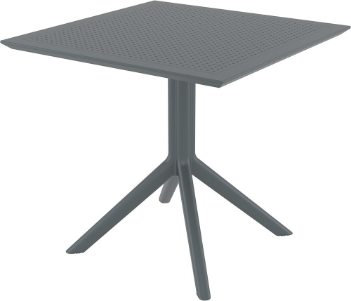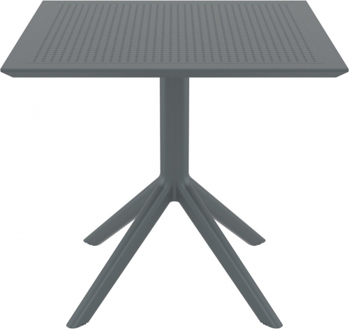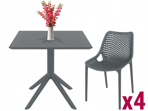 Комплект Sky Air состоит из квадратного стола и четырех стульев. Квадратный пластиковый стол Sky со столешницей из погодостойкого пластика и каркасом из металла. Стул Air с перфорированными сиденьем изготавливается из полипропилена, упрочненного стекловолокном, полученным с использованием новейшего поколения технологий формования пластмасс под давлением.