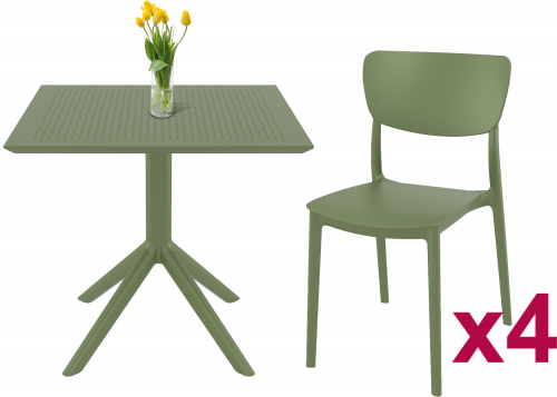 Комплект Sky Monna состоит из квадратного стола и четырех стульев. Квадратный пластиковый стол Sky со столешницей из погодостойкого пластика и каркасом из металла. Стул Monna изготавливается из полипропилена, упрочненного стекловолокном, полученным с использованием новейшего поколения технологий формования пластмасс под давлением.