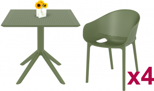 Комплект Sky 80 Pro состоит из квадратного стола и четырех кресел. Квадратный пластиковый стол Sky со столешницей из погодостойкого пластика и каркасом из металла. Легкое, как сам воздух, но при этом прочное кресло Sky Pro изготавливается из полипропилена, упрочненного стекловолокном, полученным с использованием новейшего поколения технологий формования пластмасс под давлением.