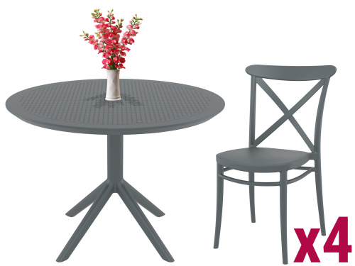 Комплект Sky Cross состоит из круглого стола и четырех стульев. Круглый пластиковый стол Sky со столешницей из погодостойкого пластика и каркасом из металла. Стул Cross изготавливается из полипропилена, упрочненного стекловолокном, полученным с использованием новейшего поколения технологий формования пластмасс под давлением.