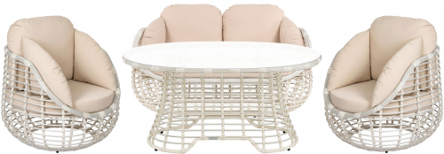 Создайте идеальную зону для обедов и встреч на открытом воздухе с готовым комплектом Lotus. Гармоничный ансамбль включает удобный двухместный диван, пару глубоких кресел и изящный стол, формируя уютное и стильное пространство для отдыха. Мягкие линии мебели и ажурное плетение создают визуальное единство и ощущение легкости.