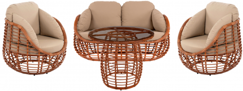 Создайте идеальную зону для обедов и встреч на открытом воздухе с готовым комплектом Lotus. Гармоничный ансамбль включает удобный двухместный диван, пару глубоких кресел и изящный стол, формируя уютное и стильное пространство для отдыха. Мягкие линии мебели и ажурное плетение создают визуальное единство и ощущение легкости.