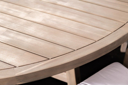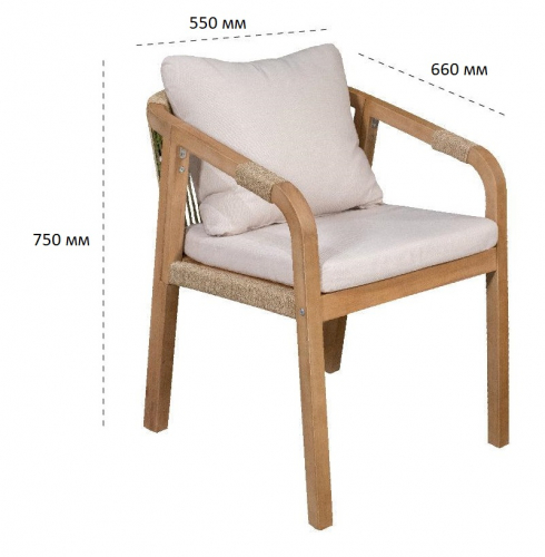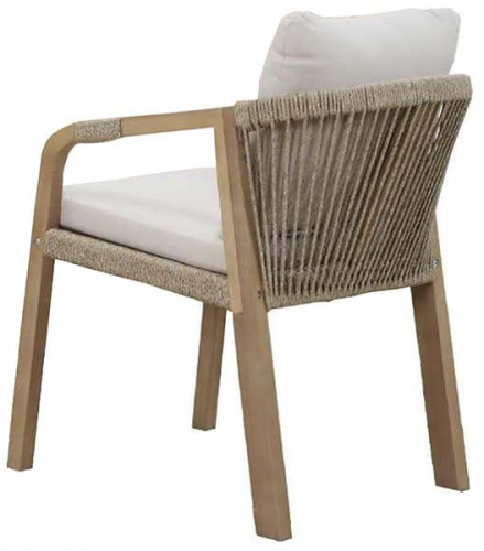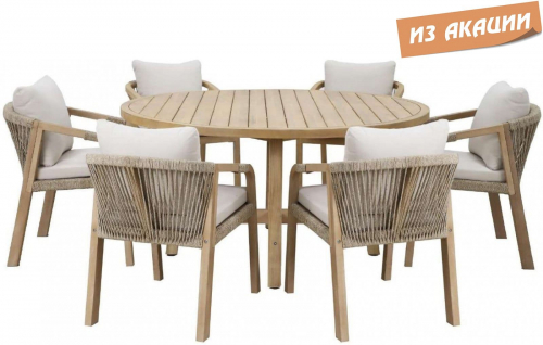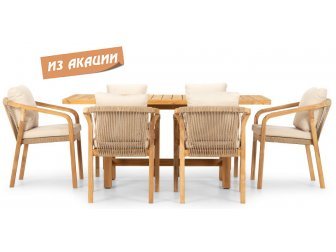 Обеденная группа Rimini, рассчитанная на 6 персон, - это садовая мебель из АКАЦИИ в современном стиле. Дизайнерские формы мебели из этой коллекции создадут стильный и узнаваемый облик зоны отдыха на вашей веранде. Rimini - это современная коллекция садовой мебели из акации, выполненная в комбинации натурального веревочного плетения роуп, акации и бежевых подушек. Цвет натуральной твердой древесины представляет собой натуральный цвет с мелкой текстурой, придающий древесине приятный теплый вид. Rimini - это стиль и элегантность на Вашей веранде.