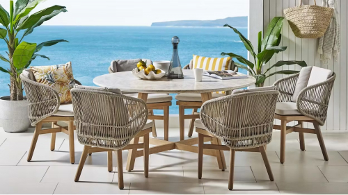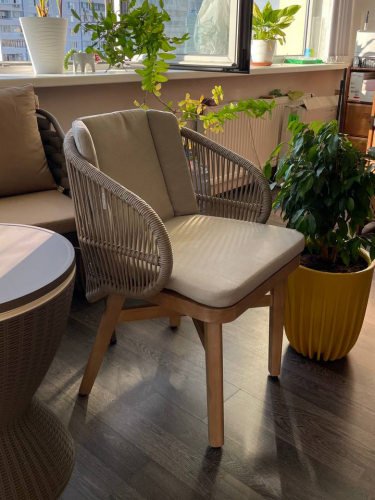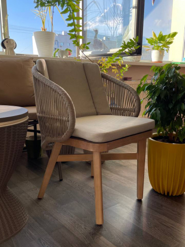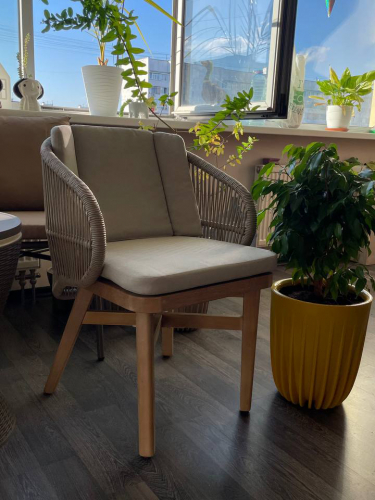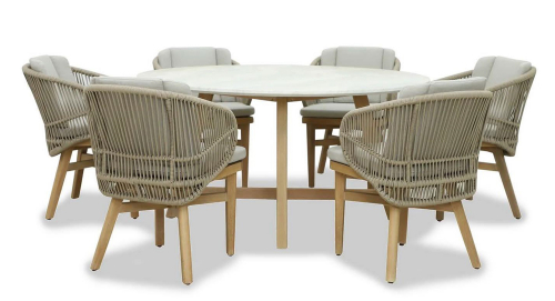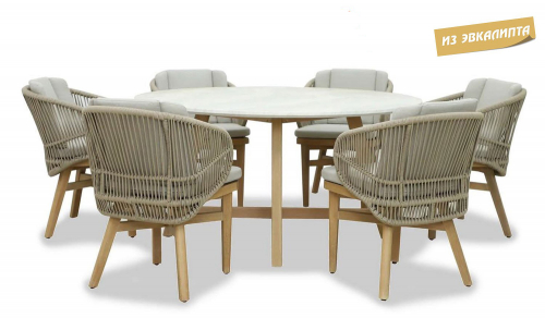 Этот ансамбль из эвкалипта с обеденным столом с оригинальной столешницей и шестью мягкими креслами с плетением из роупа, создан для незабываемых моментов на свежем воздухе.