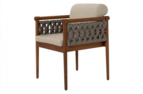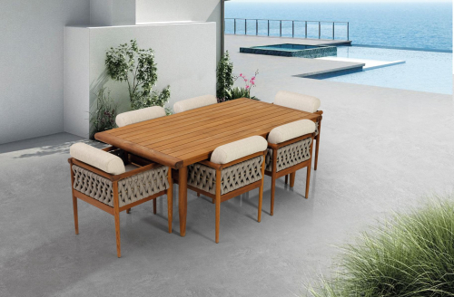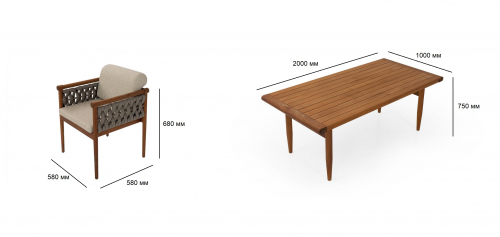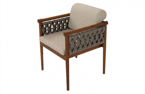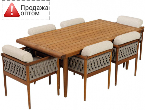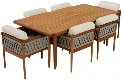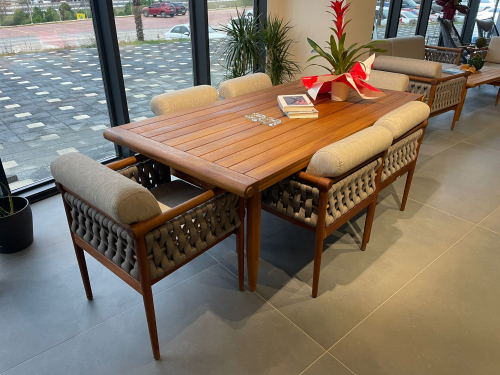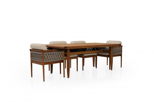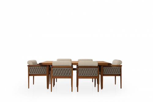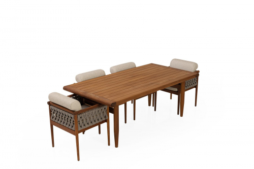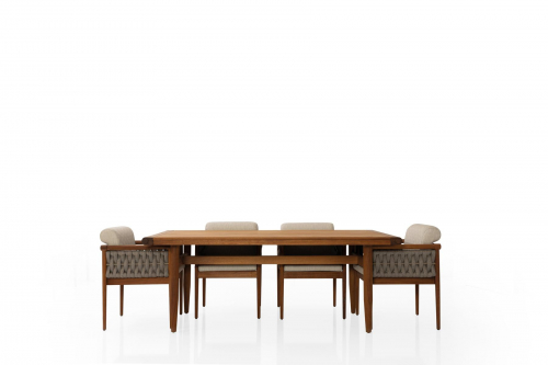 Комплект обеденной мебели Knob отличается своей долговечностью, устойчивостью к сезонным изменениям, солнечному свету и другим внешним факторам и представляет собой долгосрочную инвестицию. Использование эксклюзивных материалов, таких как дерево ироко, тщательное мастерство плетения из роупа ручной работы и особые свойства тканей для уличного использования - все это украсит Ваше жилое пространство и позволит максимально насладиться отдыхом на свежем воздухе.