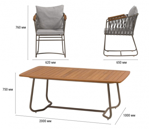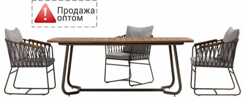 Теплая текстура натурального дерева ироко придает столешнице особую элегантность и прочность. Стильное плетение роупом по бокам стульев добавляет комплекту изысканности и оригинальности. Роуп – это современный и практичный материал, устойчивый к ультрафиолету и влаге.