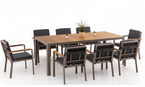 Baku - уличный обеденный комплект, рассчитанный на 8 человек. Комфортный и стильный, он выполнен в соответствии с системой менеджмента качества ISO 9001. Подходит для использования в самых разнообразных пространствах, таких как сад, балкон, терраса, зона у бассейна, пляж, зона отдыха в офисе и дома.
