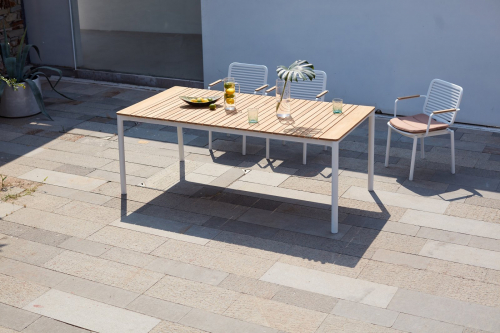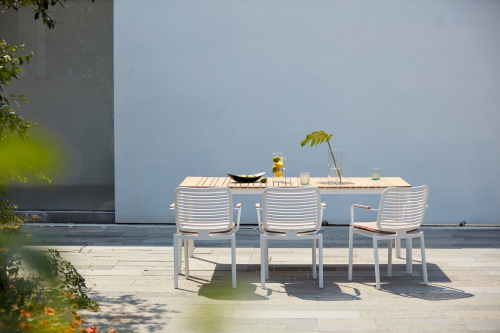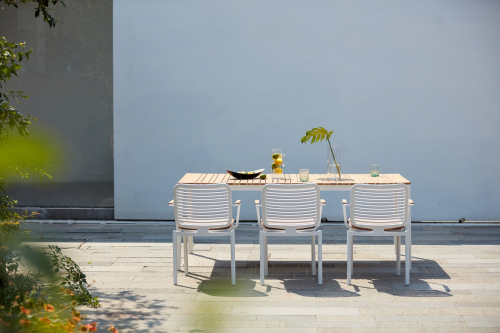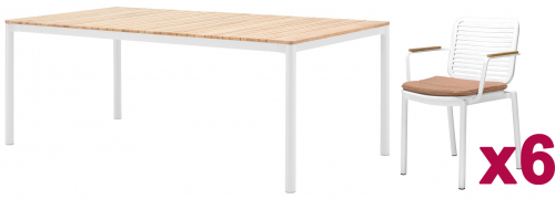 Обеденная группа Armona, рассчитанная на 6 персон, состоит из металлического стола с красивой реечной деревянной столешницей и кресел с мягкими подушками. Мебель Armona создана, чтобы выдержать испытание временем. Рама изделий изготовлена из алюминия с порошковым покрытием, что обеспечивает долговечность. Штабелируемые кресла оснащены элегантными подлокотниками из тикового дерева и съемными подушками, что делает их невосприимчивыми к различным погодным условиям.