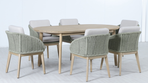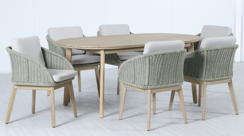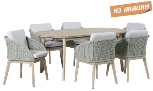 Обеденная группа Madrague на 6 персон - это элегантная коллекция уличной мебели из АКАЦИИ, выполненная в комбинации веревочного плетения роуп, акации и комплектом устойчивых к погоде подушек. Идеальна для террасы, веранды или комфортной зоны на открытом воздухе — сочетает эстетичный внешний вид, прочность и простой уход.