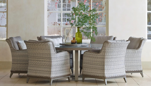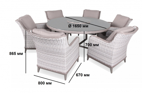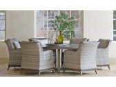 Этот ансамбль с обеденным столом с оригинальной столешницей и шестью мягкими креслами с плетением из искусственного ротанга, создан для незабываемых моментов на свежем воздухе.