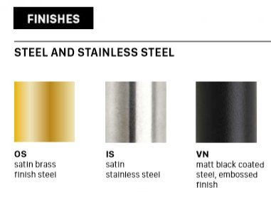 Варианты отделки: сатинированная сталь (IS), сатинированная латунь (OS), порошковое покрытие - черный (VN).