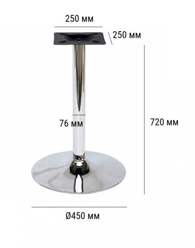 Основание "рюмочкой". Хромированное подстолье представляет собой металлическую конструкцию с эффектным покрытием. Хром отличается высокой износостойкостью, не подвержен коррозии и устойчив к температурным перепадам, что гарантирует длительный срок эксплуатации. Данная модель отлично сочетается со столешницами из МДФ, ДСП и пластика, становясь практичным решением для создания современной мебели.