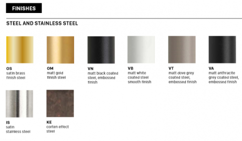 Варианты отделки: сатинированная сталь (IS), кортен (KE), сатинированная латунь (OS), матовое золото (OM), порошковое покрытие - черный (VN), белый (VB), тортора (VT), антрацит (VA).
