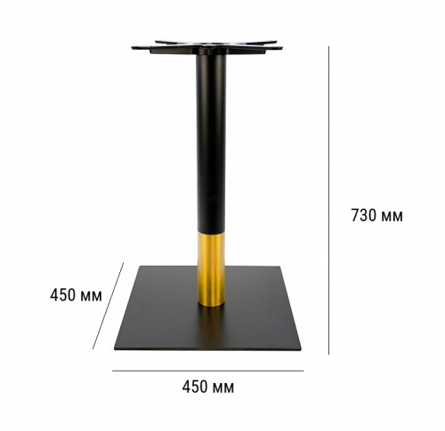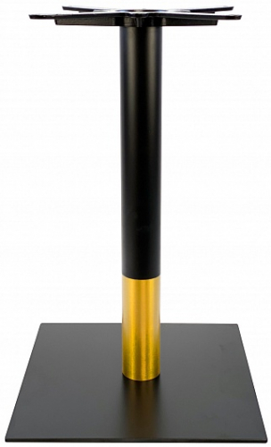 Подстолье металлическое. Труба и основание - черное порошковое покрытие матовое. Золотая вставка с матовой нержавейкой. Основание плоское.