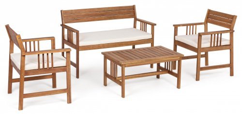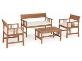 Комплект деревянной лаунж мебели Noemi отличается своим интересным, но в то же время простым дизайном. Удобные диван и кресла оснащены мягкими подушками, обеспечивающими максимальный комфорт. За счет материалов, используемых в изготовлении мебели, комплект можно использовать на открытых площадках и с удовольствием насладиться отдыхом на улице. Набор идеально украсит летние площадки, открытые террасы, подойдет для любых проектов.