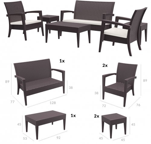 Комплект пластиковой плетеной мебели Miami Lounge с имитацией плетения натурального ротанга станет отличным выбором для обстановки лаунж-зоны в любом заведении. Благодаря использованию высококачественных материалов он долгое время не теряет своего привлекательного внешнего вида, даже несмотря на активную эксплуатацию. Благодаря отсутствию металлического каркаса и устойчивости к ультрафиолетовому воздействию комплект плетеной мебели из пластика Miami Lounge можно использовать в том числе и на открытых площадках.