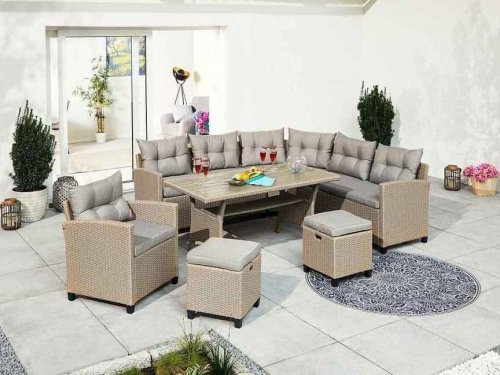 Комплект мебели AFM-373B из искусственного ротанга покорит Вас привлекательным видом и удобством. В составе комплекта: 2 дивана, угловой элемент, стол, одно кресло и 2 пуфа. Высококачественная лоза из полиротанга бежевого цвета стойкая к любым атмосферным явлениям. Крепкий стальной каркас с полимерным антивандальным покрытием и отличным качеством сварки. Изделие сплетено вручную мастерами под жестким контролем качества на каждом этапе производства. Лоза максимально приближена по рельефу и текстуре к естественному материалу. Идеально подходит для использования на улице и внутри помещения в любую погоду. Не боится воды, солнца и минусовой температуры. Диваны можно скрепить между собой скобами или раздвинуть друг от друга.
