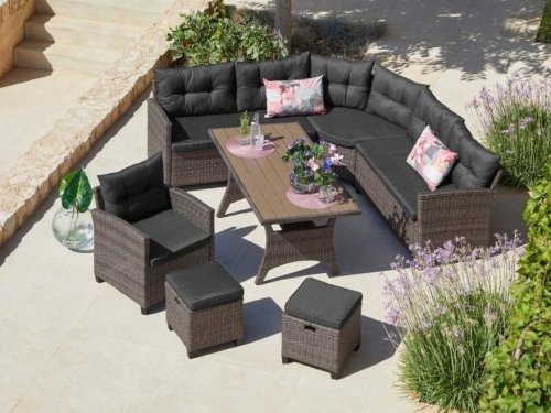 Комплект мебели AFM-373G из искусственного ротанга покорит Вас привлекательным видом и удобством. В составе комплекта: 2 дивана, угловой элемент, стол, одно кресло и 2 пуфа. Высококачественная лоза из полиротанга серого цвета стойкая к любым атмосферным явлениям. Крепкий стальной каркас с полимерным антивандальным покрытием и отличным качеством сварки. Изделие сплетено вручную мастерами под жестким контролем качества на каждом этапе производства. Лоза максимально приближена по рельефу и текстуре к естественному материалу. Идеально подходит для использования на улице и внутри помещения в любую погоду. Не боится воды, солнца и минусовой температуры. Диваны можно скрепить между собой скобами или раздвинуть друг от друга.