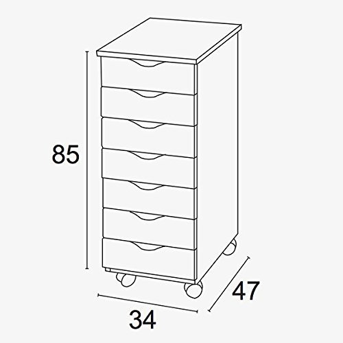 Лаконичный дизайн и белый цвет делают его довольно универсальным. Встроенные колёсики позволяют перемещать его из комнаты в комнату и к тому же не оставляют следов на полу. Каркас изделия сделан из ДСП, а фасады ящиков – из древесины бука.