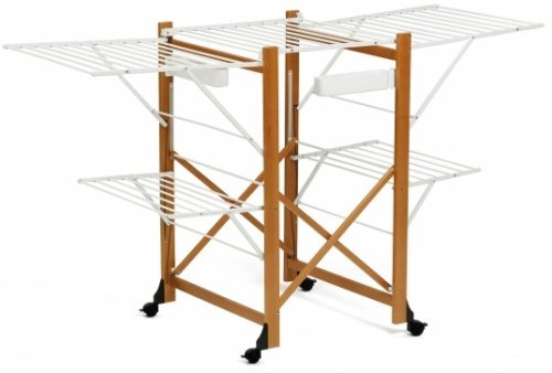 Каркас изделия изготовлен из высокопрочной древесины бука, а перекладины - из лёгкого алюминия. Помимо нескольких ярусов решёток для сушки белья, она снабжена небольшими ящиками для мелочей. Встроенные колёсики делают её очень мобильной, а складная конструкция позволяет сэкономить место в вашем доме. Особенно удобно то, что её не надо раскладывать полностью, если вам не нужна вся её поверхность.