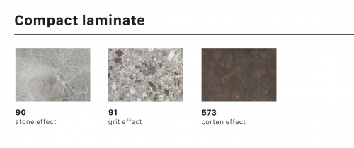 Компакт-ламинат (HPL) - это композитный материал из прочных плоских панелей, которые с двух сторон ламинированы пластиком. Столешницы обладают высокой устойчивостью к физическому, механическому и температурному воздействию. Отличаются высокой прочностью, ламинированный слой защищает столешницу от различных возможных деформаций и химических воздействий на поверхность. Ламинированные столешницы имеют целый пакет характеристик: ударопрочный материал, защищающий от физических воздействий колющих, режущих и царапающих инструментов, слой ламината-пленки, защищающий поверхность от химических воздействий влаги, кофе, уксуса и других.