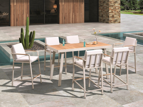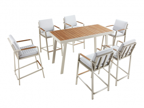 Прочная конструкция мебели изготовлена из алюминия со вставками из тикового дерева. Ансамбль сохраняет яркий внешний вид в нейтральных тонах, который прекрасно впишется во многие помещения, как частные, так и коммерческие. Все дополняется толстыми подушками на сиденьях и спинке, благодаря которым поддерживается высочайший уровень комфорта и расслабления.