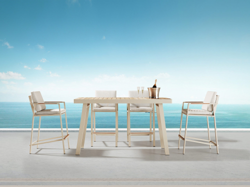 Мебельный гарнитур Higold из коллекции Nofi рекомендуется для вечеринок на свежем воздухе, в саду или на террасе. Набор из четырех барных кресел с подушками и подлокотниками объединен с барным столом со столешницей из тикового дерева. Комплект отличается оригинальностью, минималистичным дизайном, который привлечет внимание многих любителей современных тенденций, а утилитарный аспект порадует любителей активного отдыха.