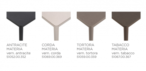 Столешница доступна в четырех вариантах отделки ламината, изготовленных эксклюзивно для Nardi, которые тон в тон с основанием, к которому столешница монтируется заподлицо, создавая эффект предельной формальной простоты. Текстурированная отделка не только придает ей изысканный вид, но и уменьшает видимость отпечатков пальцев, делая ее более практичной.