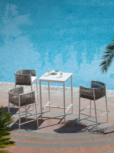 Стол выполнен из алюминия с порошковым покрытием. Выбор алюминия в качестве основного материала обеспечивает лёгкость, устойчивость к погодным условиям и минимальные требования к уходу, что делает мебель идеальным выбором для тех, кто ищет высококачественную и долговечную садовую мебель.
