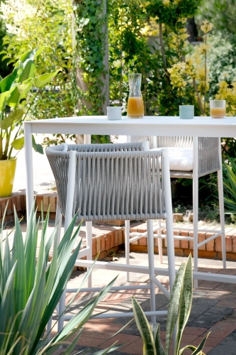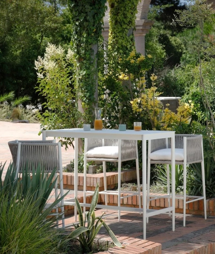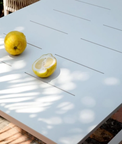 Стол выполнен из алюминия с порошковым покрытием. Выбор алюминия в качестве основного материала обеспечивает лёгкость, устойчивость к погодным условиям и минимальные требования к уходу, что делает мебель идеальным выбором для тех, кто ищет высококачественную и долговечную садовую мебель.