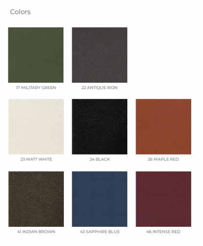 Материал: окрашенная сталь. Состав: железо и углеродный сплав с содержанием углерода менее 2%, обработанные, чтобы выдерживать воздействия окружающей среды, с помощью уникально антикоррозионной обработки EMU-Coat.