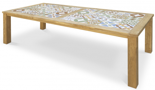 Balmes — это прочная и надежная коллекция. Столешница состоит из мозаики разноцветных гидравлических плиток. Их геометрические формы напоминают самые сложные художественные узоры каталонского модернизма. Твердая структура тикового дерева придает значимость каждому предмету.