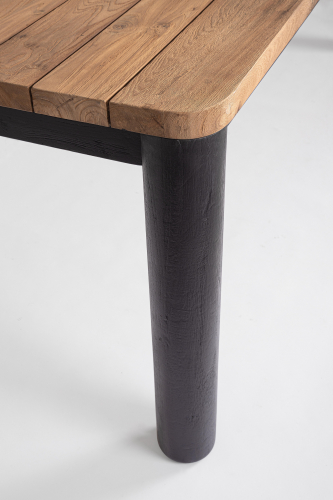 Обеденный стол Roderick - это сочетание природной красоты и экологической ответственности. Его верхняя столешница и ножки изготовлены из переработанного тика. Штифты из различных пород дерева, используемые в столешнице, придают ей еще большую индивидуальность.