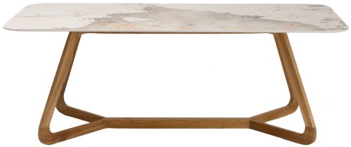Основание из натурального тика вдохновлено твердыми ветвями, которые прочно поддерживают столешницу, изготовленную из элегантной керамики.