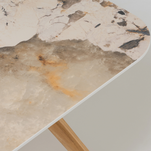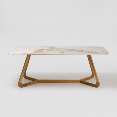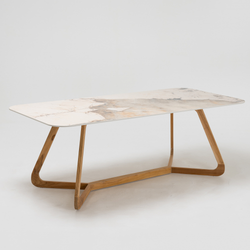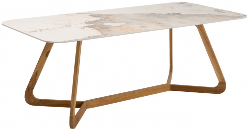 Основание из натурального тика вдохновлено твердыми ветвями, которые прочно поддерживают столешницу, изготовленную из элегантной керамики.
