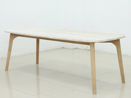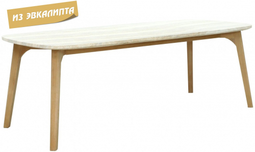 Большой обеденный стол Mali, рассчитанный на 6 персон, выполнен из эвкалипта, столешница с утонченным краем в виде акульего носа - из искусственного камня Travertine.