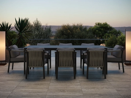 Элегантный обеденный стол из коллекции Lorvain объединяет выразительную чёткость линий и выверенные пропорции с высокой практичностью. Прочный алюминиевый каркас с порошковым покрытием обеспечивает коррозионную стойкость и надёжность в любых погодных условиях, а столешница из спечённого камня придаёт поверхности премиальную долговечность и лёгкость в уходе.